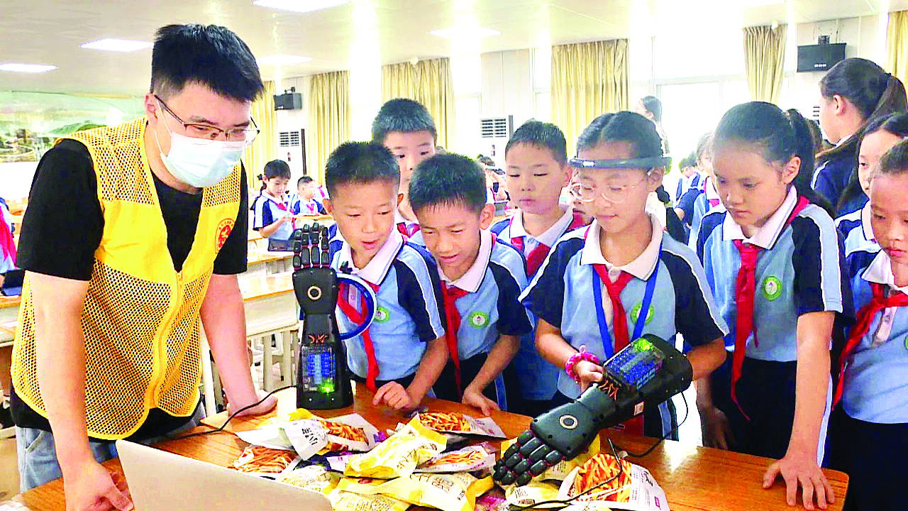 在活動(dòng)現(xiàn)場(chǎng),科普講師系統(tǒng)介紹了腦機(jī)接口技術(shù)及腦電設(shè)備的設(shè)計(jì)原理,并通過(guò)視頻呈現(xiàn)了智能仿生手的實(shí)際應(yīng)用。講師還通過(guò)講述古今科學(xué)家矢志報(bào)國(guó)、勇攀高峰的感人事跡,結(jié)合我國(guó)科技創(chuàng)新的重大進(jìn)展,生動(dòng)闡釋了“愛(ài)國(guó)”與“愛(ài)科學(xué)”的統(tǒng)一,進(jìn)一步激發(fā)了同學(xué)們的民族自豪感和科技報(bào)國(guó)的使命感。