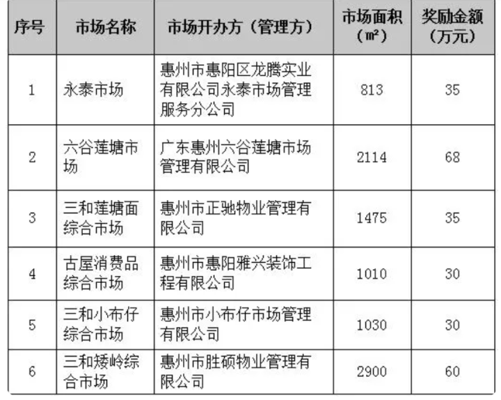 免費(fèi)為各農(nóng)貿(mào)市場(chǎng)精準(zhǔn)編制“一場(chǎng)一策”施工方案和施工清單;在全市率先制定出臺(tái)《惠陽(yáng)區(qū)農(nóng)貿(mào)市場(chǎng)綜合治理提質(zhì)升級(jí)獎(jiǎng)勵(lì)辦法》,對(duì)按標(biāo)準(zhǔn)、積極開展農(nóng)貿(mào)市場(chǎng)提質(zhì)升級(jí)的市場(chǎng)給予最高100萬(wàn)元的資金獎(jiǎng)勵(lì);引入金融機(jī)構(gòu)對(duì)接農(nóng)貿(mào)市場(chǎng),幫扶企業(yè)和商戶解決資金問(wèn)題,放發(fā)相關(guān)低息貸款5840萬(wàn)元……