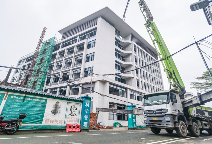 與三和街道毗鄰的沙田鎮中心衛生院改擴建項目現場,工人正在忙碌施工,機器有序作業。該院成立于1957年,院內設施設備老舊。2018年,沙田鎮中心衛生院改擴建項目啟動建設并于2020年納入當年的惠陽區民生實事項目和區衛生健康事項重點項目。項目占地1128平方米,總建筑面積8348.84平方米,地下一層地上六層。目前,該院主體建筑已封頂,完成工程量86%。