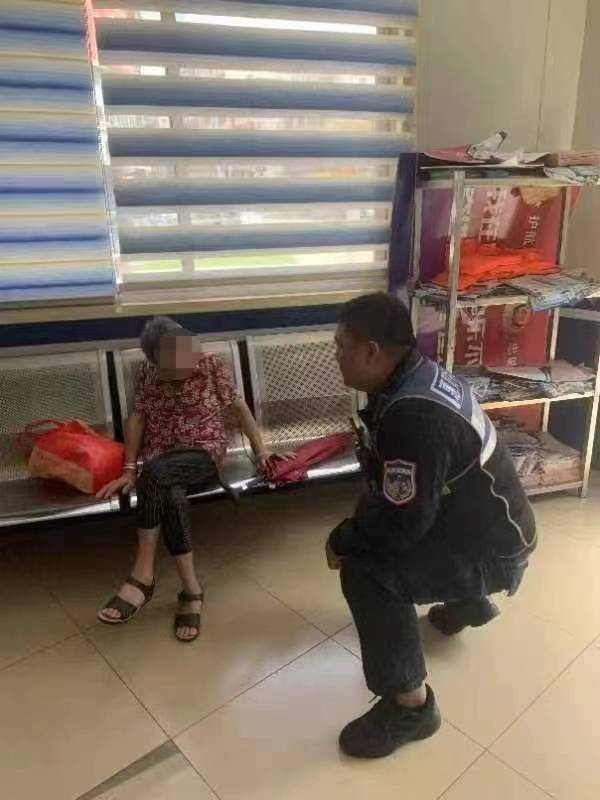 6月27日下午,惠州市惠陽區淡水街道,一位拄著拐杖的老太太來到石橋執勤崗亭求助,兩名巡警隊員巫惠聰、許德武接待了老人,眼看著老太太有點緊張,氣喘吁吁,兩人馬上讓老人坐下,并蹲在地上細心詢問老人的情況。老人姓李,她說自己早上出來散步迷路了。
