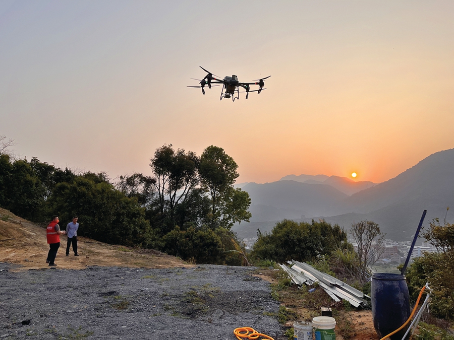 長龍村供銷社助農服務中心飛防專業服務隊利用無人機提高作業效率。 惠州日報記者李芳娟 通訊員張偉鋒 攝