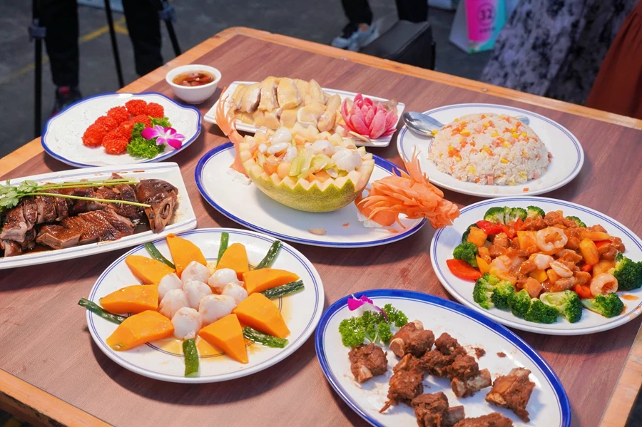 飯桌上七菜加炒飯,美味又創意。客家人招待當屬“無雞不成宴”。貴妃荔枝雞是一道承載了鎮隆豐富文化內涵的佳肴,精選荔枝果園走地雞,用荔枝湯慢煮浸熟,為雞肉增添了獨特的荔枝果香。荔枝海味奇緣清爽解膩,荔枝與蝦球、哈密瓜、百合、芹菜等食材跨界混搭,是傳統海鮮烹飪的創新與融合。荔枝蝦球是一道創意與美味兼具的精致菜品,鮮嫩大蝦搭配爽脆的馬蹄巧妙地制成蝦球,裹上脆花粒入鍋油炸,出鍋后是一顆顆形如荔枝的精致炸物,幾乎以假亂真。荔香客家祿鵝采用鎮隆獨有的祿鵝烹飪方式,將荔枝的清香滲入鵝肉當中,使鵝肉充分吸收了荔枝的果香和清甜,同時自身的肉香也得以完美保留,并佐以秘制醬料,讓人口齒留香。荔枝咕嚕肉,將精選五花肉裹粉入鍋油炸成外層酥脆,佐以荔枝酸甜開胃,清爽不油膩,且散發著淡淡果香。還有醬香荔枝骨是一道結合了荔枝的果香與排骨肉香的新式菜品。