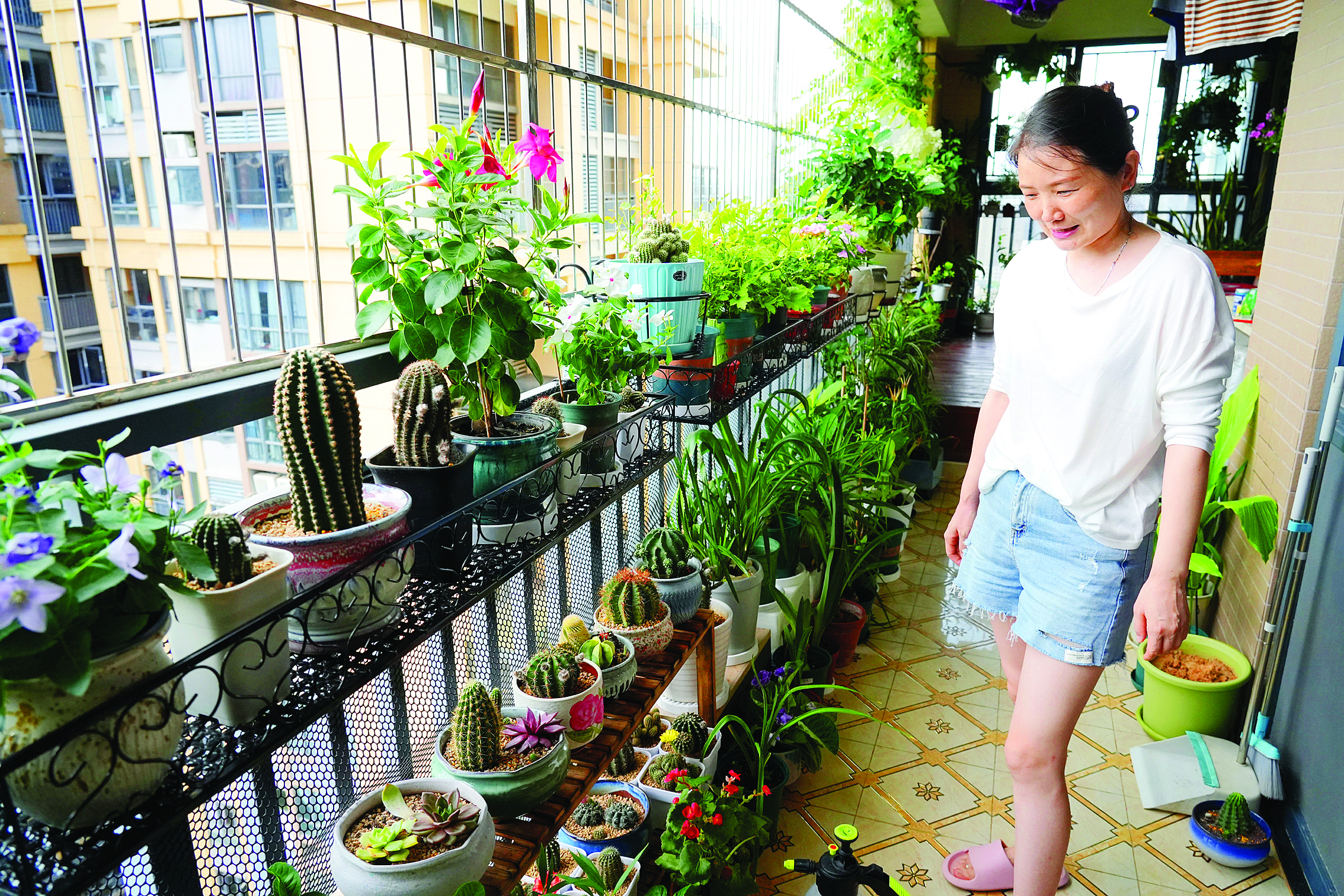自2014年住進淡水后,石林敏與丈夫都喜歡栽花植綠,陽臺成了夫妻倆種植綠植鮮花的區域,工具、肥料等應有盡有。石林敏說,每天要花一個小時來打理陽臺的綠植,高溫天氣還要澆水兩次,對各種花草的打理也是了然于胸,這種“沾花惹草”的日子讓她感受到了歲月靜好。