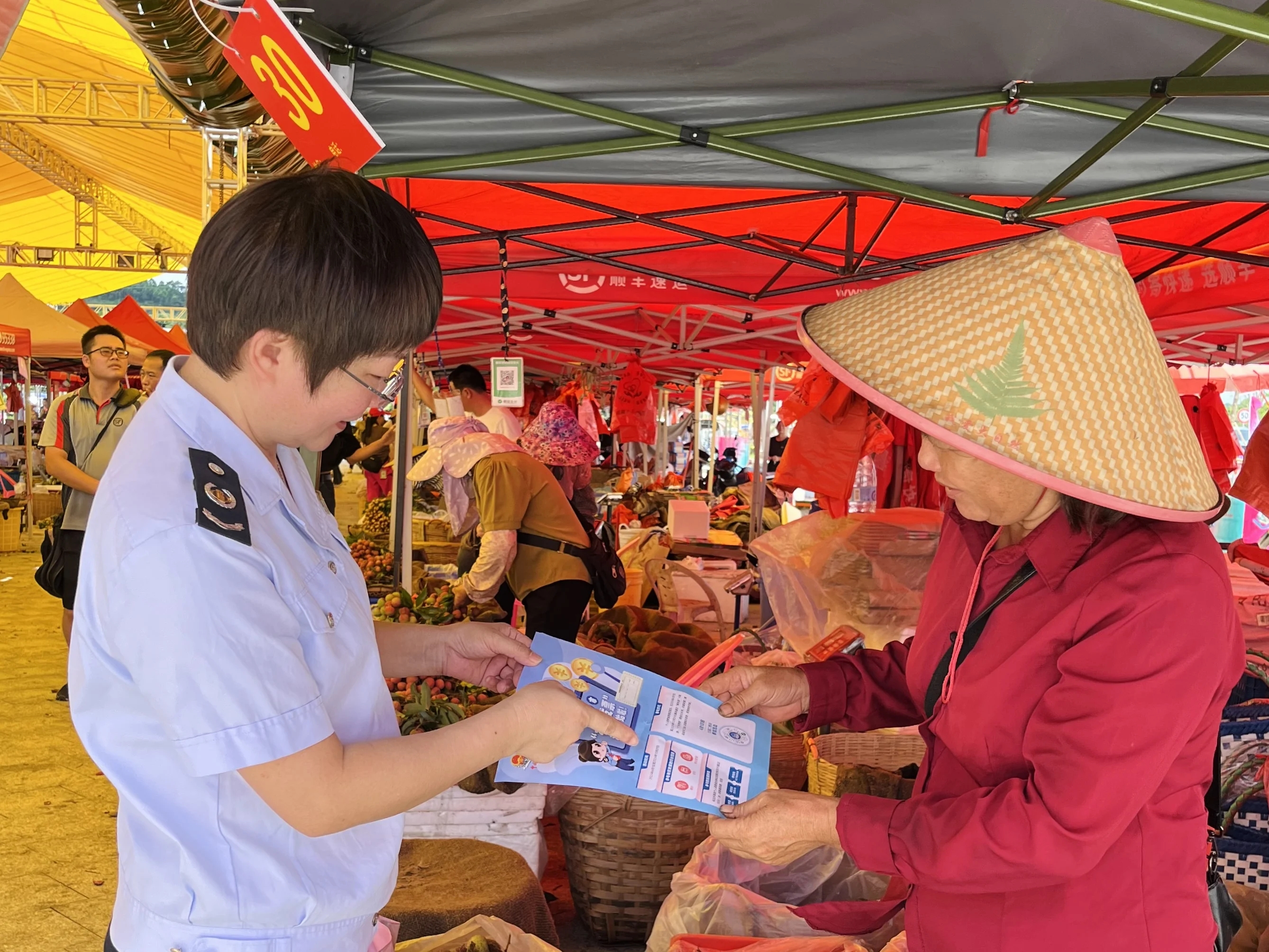在鎮隆荔枝交易火爆之際,惠陽區稅務局走進惠陽區RCEP廣東惠州(鎮。├笾灰字行,現場宣傳農產品增值稅稅收優惠政策、詳細講解發票開具等熱點知識,吸引大批果農、采購商、消費者紛紛駐足咨詢。