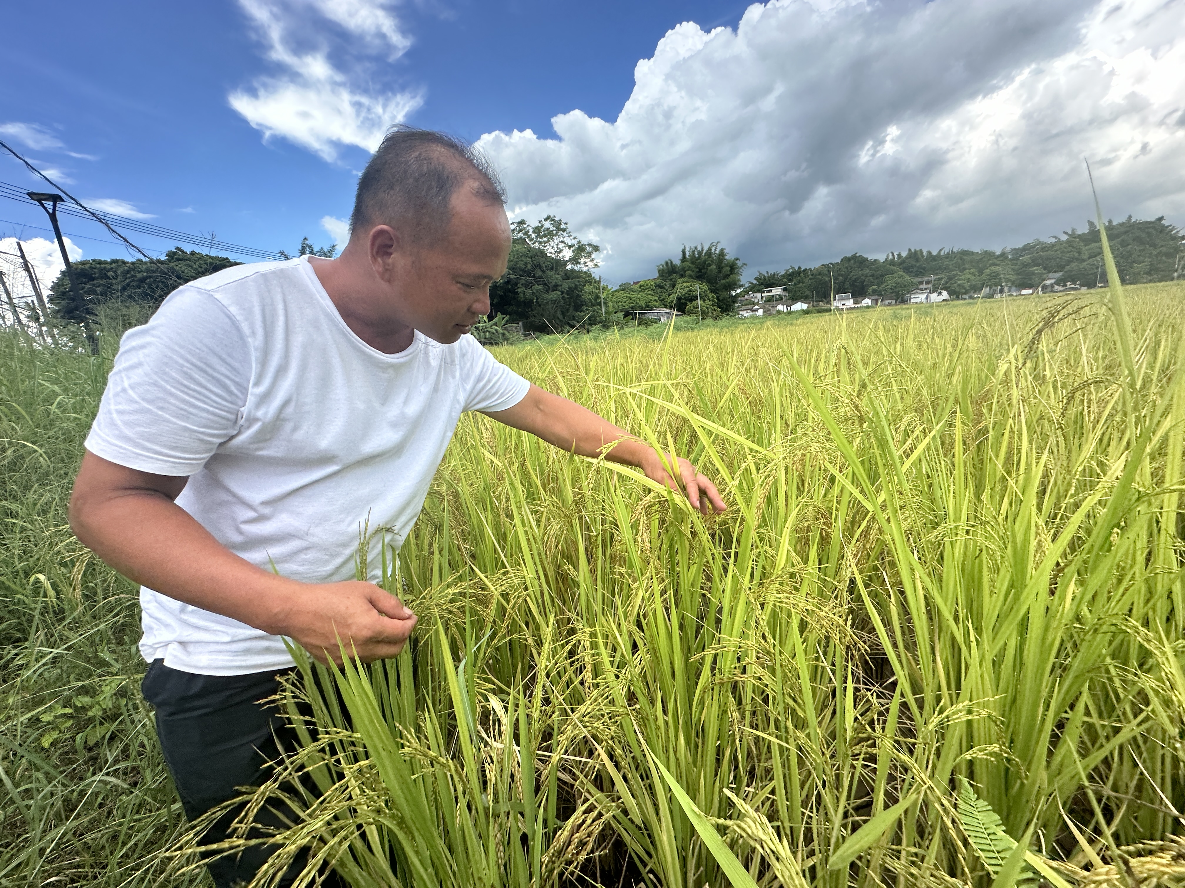 嚴杰寬介紹試驗田里種植的新品種水稻。
