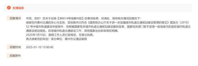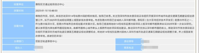 惠陽區(qū)交通運(yùn)輸局信訪中心也在“惠民在線”回復(fù)指,深圳市發(fā)改委目前正組織開展深圳市城市軌道交通第五期建設(shè)規(guī)劃調(diào)整工作,擬于2025年完成規(guī)劃調(diào)整上報(bào)國家發(fā)改委審批。