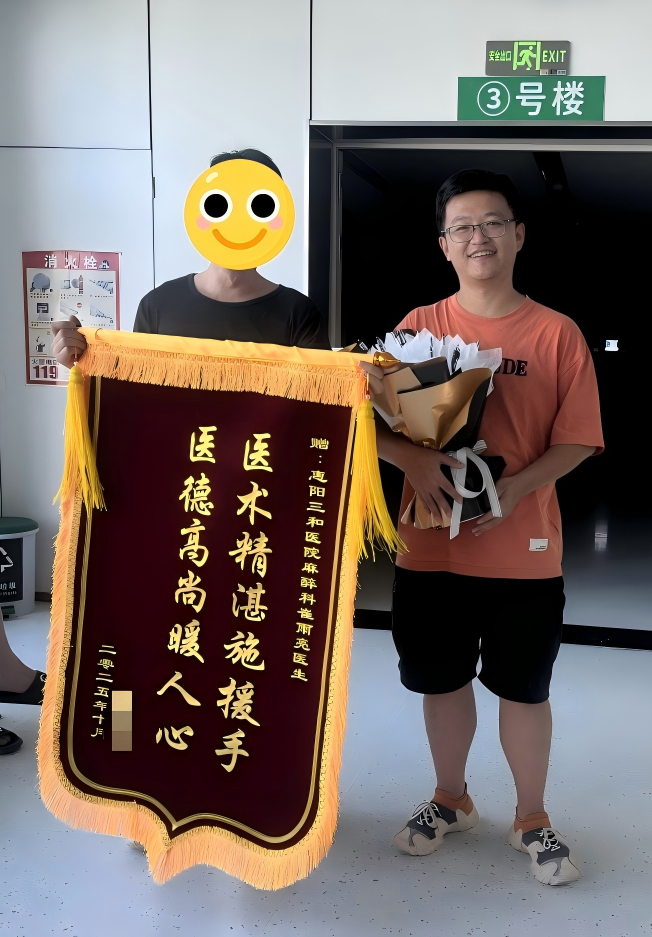“崔醫生,那天要是沒有您,我真不知道該怎么辦!”10月2日上午,惠陽三和醫院手術室門外,一名年輕男子手捧一面鮮紅錦旗,懷中還抱著一束用筆精心制作的紙藝花束,在人群的目光中徑直走向手術室門口,只為尋找那位讓他銘記于心的崔雨亮醫生。