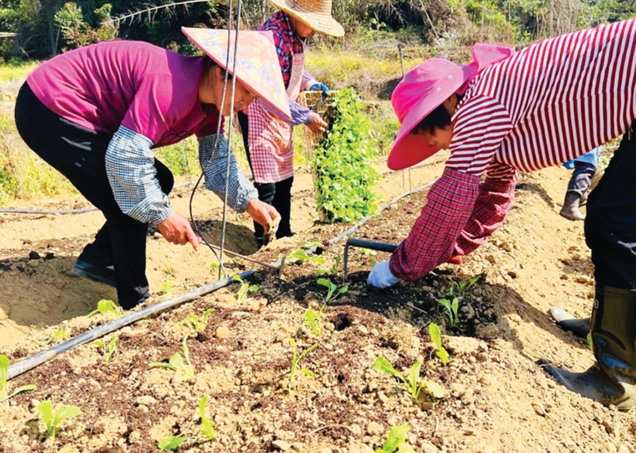 隨后,記者驅車來到距離鄔村村約15公里的龍城街道三洞村華通農產品專業合作社看到,合作社負責人正趁著晴好天氣,組織社員進行梅菜苗移栽工作,拔苗、打窩、移栽、施肥、鋪設噴灌管道……社員們分工協作,田間地頭一片歡快的勞動景象。