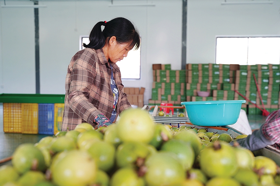 上東村百香果種植基地里,工人正在檢查果子品相。