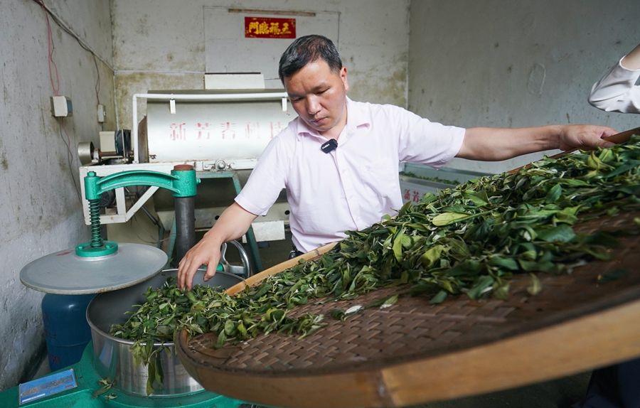 龍門縣南昆山毛茶制作技藝非遺項(xiàng)目傳承人張偉輝近期獲制茶傳承人表彰。惠州日?qǐng)?bào)記者湯渝杭 攝