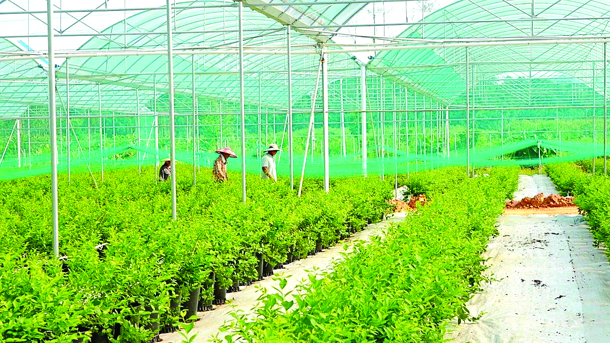 藍(lán)莓基地農(nóng)業(yè)大棚里,藍(lán)莓幼苗被精心培育在花盆中。 惠州日?qǐng)?bào)記者黃宇翔 通訊員龍融心 攝