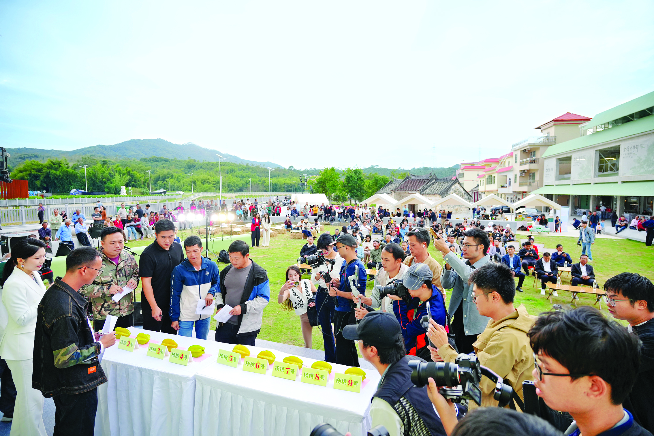 隨后,大家來到活動的主會場千年古榕驛站廣場,在古榕樹下,麻榨鎮楊桃文化節開幕。精彩的節目表演后,臺上舉辦的“楊桃王”評選和拍賣將氣氛帶入高潮。種植戶挑選出個頭最大、品質最好的楊桃在臺上展示,農業技術員作為評委,從楊桃的果形、色澤、重量等維度進行綜合打分,最終評選出“楊桃王”,并評選出一、二、三等獎。