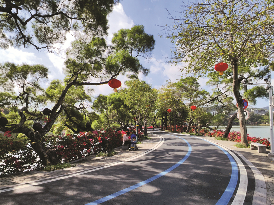 “春夏賞魚木,秋冬看梅花(三角梅)!苯冢葜菸骱惞倘敲肥⒎,紅的粉的美艷奪目,為湖堤增添靈動色彩,成為網(wǎng)紅打卡點。