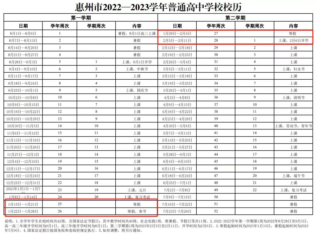 惠州市普通高中寒假起始時間為2023年1月15日開始;開學時間為2月6日。