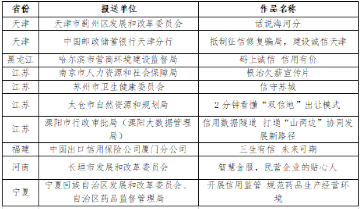經初步遴選和嚴格專家評審,組委會最終評定專家評分前150名的信用案例為優秀信用案例,評定“最佳誠信文化獎”“最佳動畫獎”“最佳紀實獎”“最佳劇情獎”“最具傳播創新獎”和“最具實效獎”6類各10個優秀微視頻。同時,授予廣東省發展和改革委員會、江蘇省發展和改革委員會、浙江省發展和改革委員會、天津市發展和改革委員會、河南省發展和改革委員會、等5家單位最佳組織獎。獲獎案例和微視頻還將在新華信用平臺、新華財經客戶端等平臺同步展播。