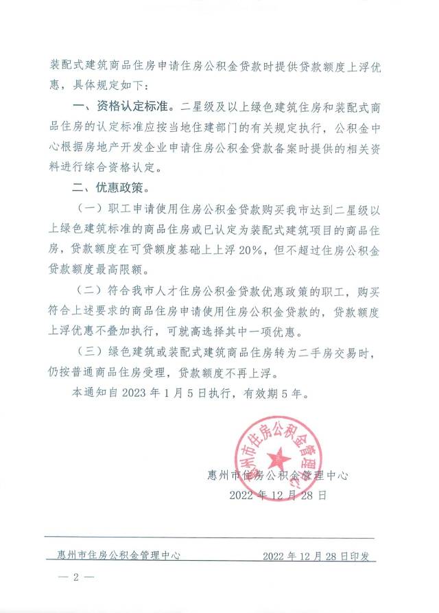 據(jù)該中心發(fā)布的《關(guān)于實施我市綠色建筑和裝配式建筑項目商品住房住房公積金貸款額度優(yōu)惠政策的通知》(下稱《通知》),自2023年1月5日起,中心針對符合惠州市公積金貸款條件的職工購買惠州市綠色建筑或裝配式建筑商品住房申請住房公積金貸款時提供貸款額度上浮優(yōu)惠。