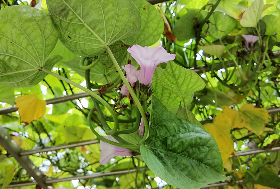 番薯結(jié)在樹上、掛在空中,是怎樣做到的?博羅縣農(nóng)業(yè)科技示范場工作人員介紹,培育番薯樹,首先得給根系創(chuàng)造最佳的根域環(huán)境條件,讓根系不衰老能保持強勢的吸收能力,為藤薯的超常規(guī)發(fā)育創(chuàng)造最佳的溫度、氧氣、水分、營養(yǎng)條件,使吸收根高效吸收。“這是藤蔓無限化生長的最重要基礎(chǔ)。在栽培上,大多采用深液流栽培與簡易的氣霧栽培。”他說,番薯屬于無限生長型品種,只要溫室條年適宜,番薯可作多年生栽培,這里看到的番薯樹是中國農(nóng)科院環(huán)發(fā)所設(shè)施中心培育的二年生番薯樹,占地面積已近200平方米,生長還猶為旺盛。