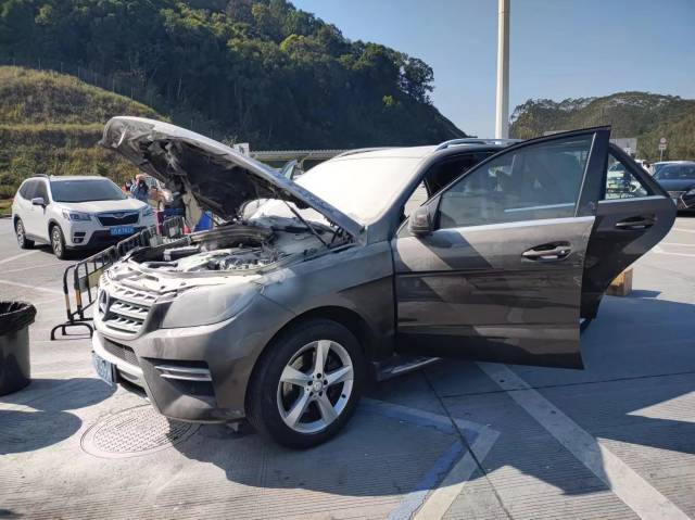 1月18日,在通驛粵東分公司所轄紫惠高速橫瀝停車區(往揭陽方向),一輛停放的奔馳車車頭突然著火。緊急關頭,交通協管隊員化身消防員,3分鐘就把火撲滅了。
