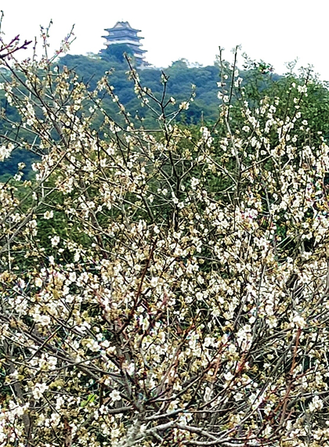 透過花海,看到遠處高榜山的掛榜閣。