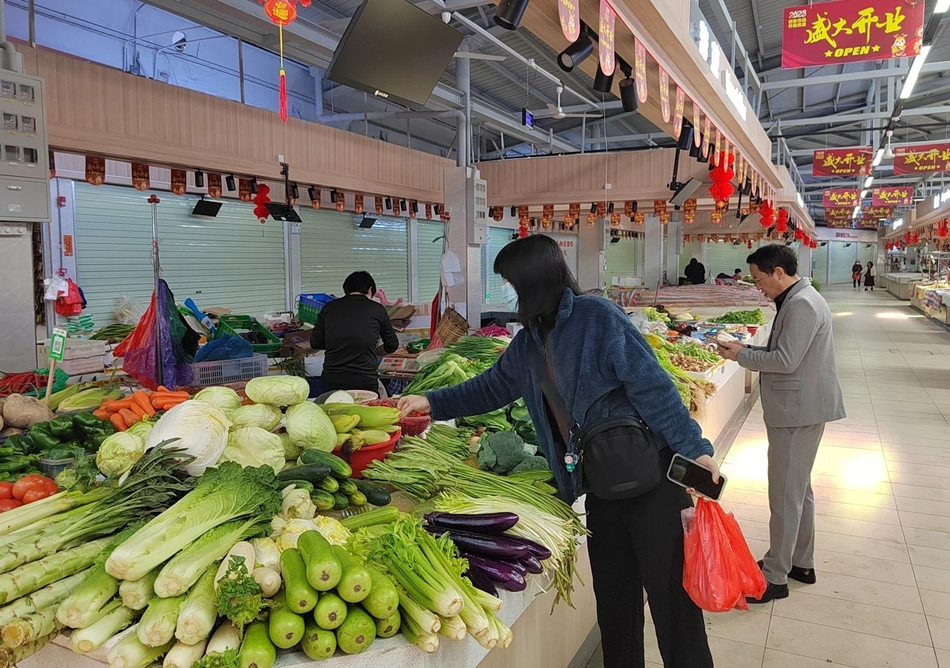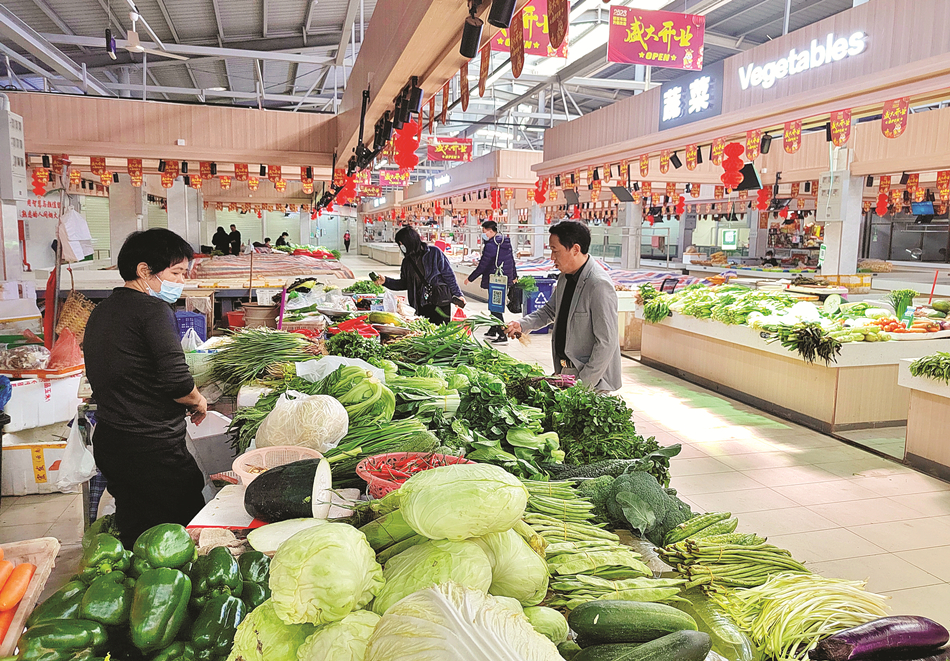 放眼望去,溫暖的陽光穿過頂棚上的透明瓦,整個菜市場顯得更加寬敞明亮,格局布置干凈清爽。家常的蘿卜青菜、紅紅的辣椒、當季的甜菜心……蔬菜攤上色彩斑斕,一排排,擺放得整整齊齊,等待著人們來挑選。蔬菜區、肉類區、熟食區、南北干貨等區分開來,各類農副產品品種豐富,陳列整齊有序。
