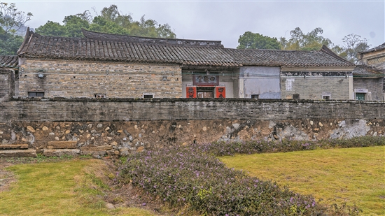 緊鄰著五經魁,四德堂是一座客家傳統圍屋風格的古建筑,始建于道光末年。四德堂坐西北朝東南,占地面積1500平方米,建筑格局為三進二橫屋,兩側設有門樓。大門墻體以石塊鋪設,門中設有兩個青石座,顏色青綠,紋理均勻,相傳石座取材于羅浮山深處。墻體繪有壁畫,封檐板木雕做工精細。至今,仍有后人在此居住,保存完好。