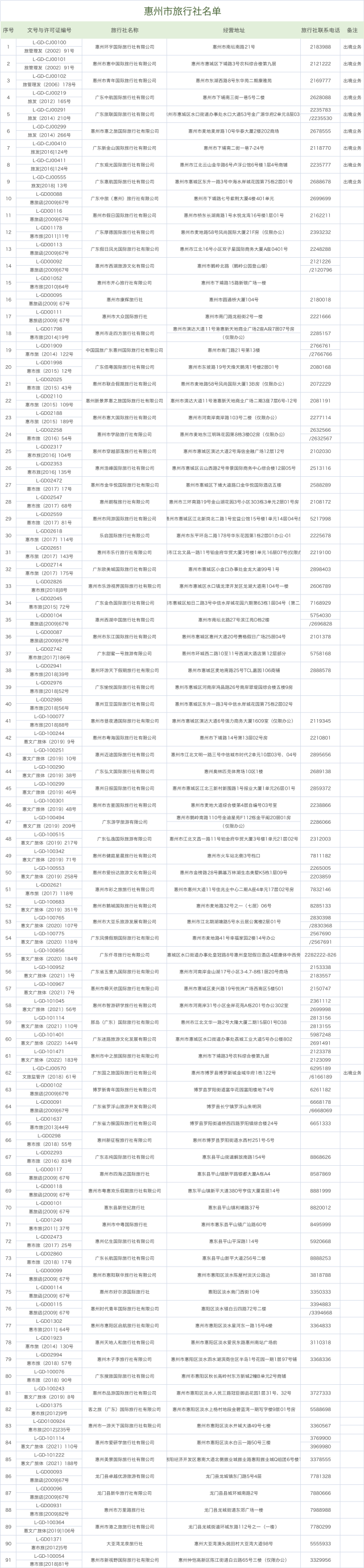 記者了解到,目前,在惠州市文化廣電旅游體育局市場管理科登記備案的旅行社共有91家,具備經營出境業務資質的僅10家。廣大市民朋友出境旅游要選擇有合法資質的旅行社,并簽訂正規旅游合同,索要發票,在旅游中遇到糾紛要及時咨詢或向文旅部門投訴。