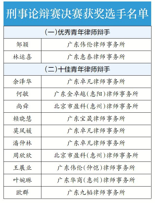 最終,論辯賽共決出2名惠州市首屆刑事論辯賽優秀青年律師辯手、10名十佳青年律師辯手(下面表格中前三為最佳青年律師辯手),以及8名惠州市首屆民事論辯賽優秀青年律師辯手、10名十佳青年律師辯手(下面表格中前三為最佳青年律師辯手)。