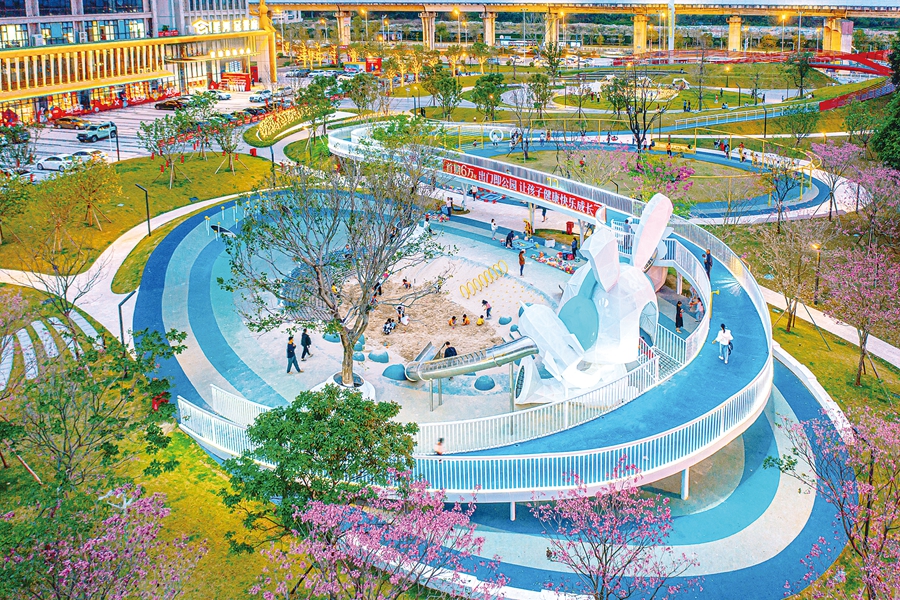 記者在這里看到,公園里設置了許多互動性、參與度極高的健身設施,將體育休閑文化融入生活中,孩子和大人在這里都能尋得自己的樂趣。閑置的公園一角轉變成可持續、綠色、自然及社交的公共活動區,營造出自然豐富的城市生活體驗。到了傍晚,華燈初上,公園里依然人聲鼎沸,成人們談天說地,孩子們無憂無慮,拋卻了白日里的繁忙勞累,享受自己的夜晚時間,滿園的林木都沉浸在點點燈火里。
