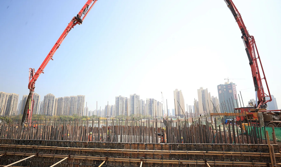 2月28日晚開始承臺澆筑的是金山湖一號橋。記者3月1日上午在現(xiàn)場看到,混凝土天泵車伸出長臂,將一車車混凝土澆筑到承臺內(nèi)!拔覀冋谶M(jìn)行0號承臺的混凝土澆筑施工,橋梁共設(shè)置2個(gè)承臺,承臺長44.61米、寬36米、高4.5米,單個(gè)承臺混凝土方量為7300立方米!苯鹕胶惶枠蝽(xiàng)目副經(jīng)理鄧子敬介紹,金山湖一號橋橋梁全長283米,為保證一次性跨越金山湖水道,橋梁設(shè)計(jì)凈跨達(dá)到196米,在相同結(jié)構(gòu)橋梁中,其跨度在全國位居前列。