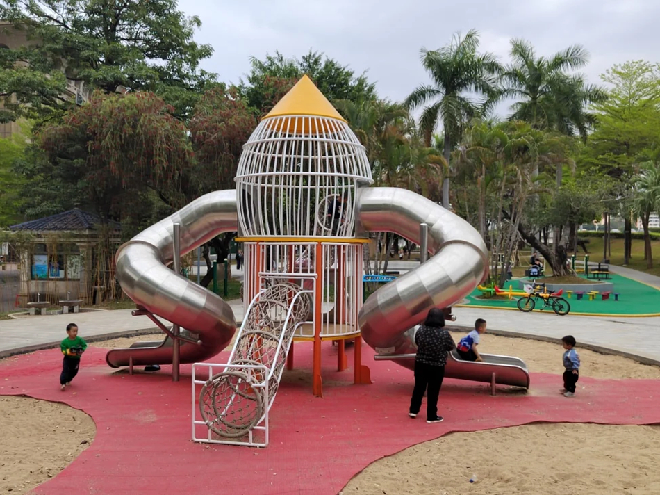 荷香園的兒童游樂區(qū),家長帶著孩童嬉戲玩耍。