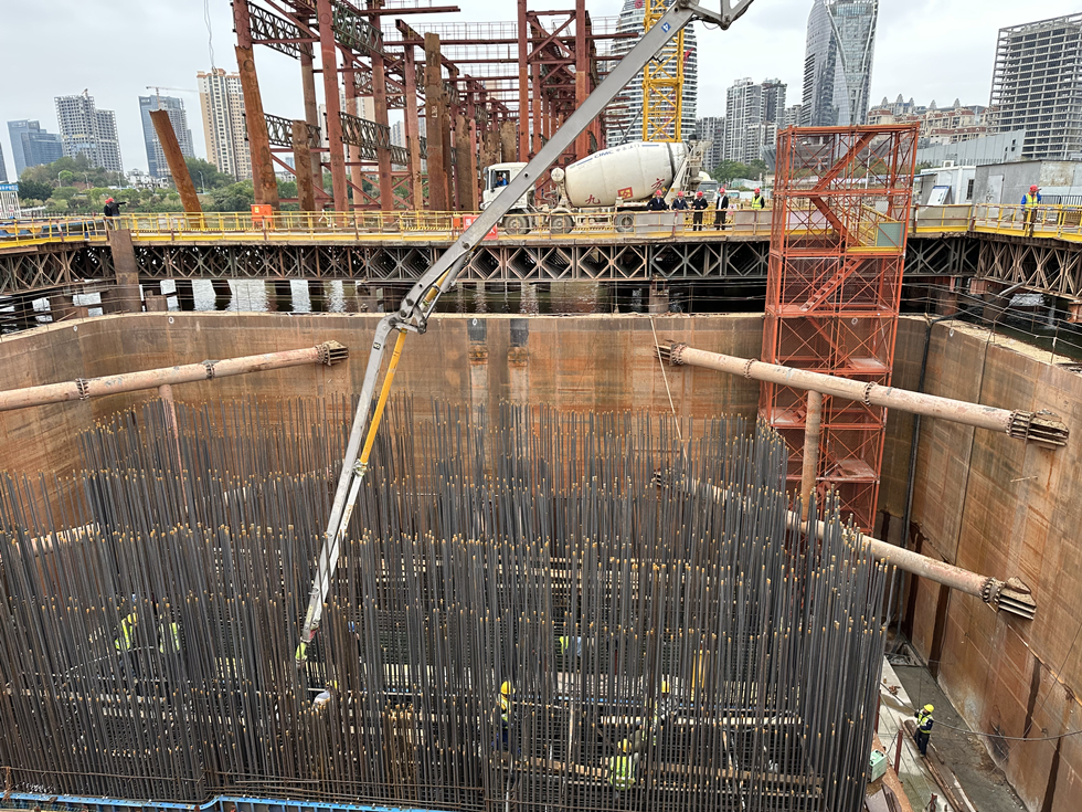 連日的陰雨天氣,沒有澆滅項目施工的大干熱潮,施工人員風(fēng)雨無阻,冒雨24小時施工,比原計劃提前3天完成本次墩身澆筑。ZP3墩身澆筑混凝土量高達(dá)5105立方,是全橋墩柱鋼筋綁扎量最大、難度最高的墩柱。根據(jù)項目施工方案,ZP3墩身將分成6次澆筑,預(yù)計6月完成澆筑。