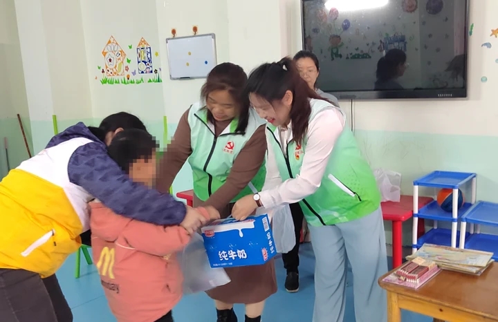 志愿者給“星孩”贈送慰問物資及學習用品。