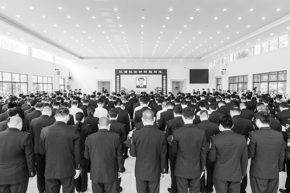 4月14日上午,廣東省惠州市龍門縣公安局因公犧牲民警鐘明超同志遺體告別儀式在惠州市殯儀館舉行。現場莊嚴肅穆、哀樂低回。在“沉痛悼念鐘明超同志“的電子屏下,懸掛著鐘明超同志的遺像,遺體安臥在鮮花叢中,鮮紅的黨旗覆于胸前。參加告別儀式的全體同志肅立脫帽,頷首默哀,依次瞻仰遺容,沉痛含淚告別鐘明超同志。全省公安機關通過視頻會議,在省廳機關、全省各地市、各縣(區)和各基層所隊為鐘明超同志默哀送別。