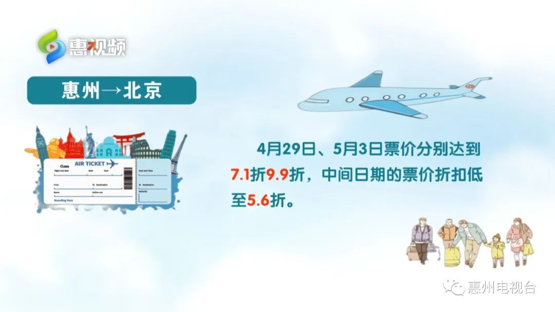 票價方面,記者25號在攜程網查詢了解到,惠州直飛北京的機票,4月29號、5月3號的票價分別為7.1折、9.9折,中間日期的票價折扣較多,低至5.6折。