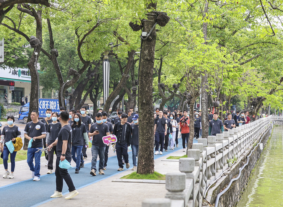 “全民反詐”宣傳公益撿跑隊伍在市區西湖周邊進行撿跑和反詐宣傳活動。