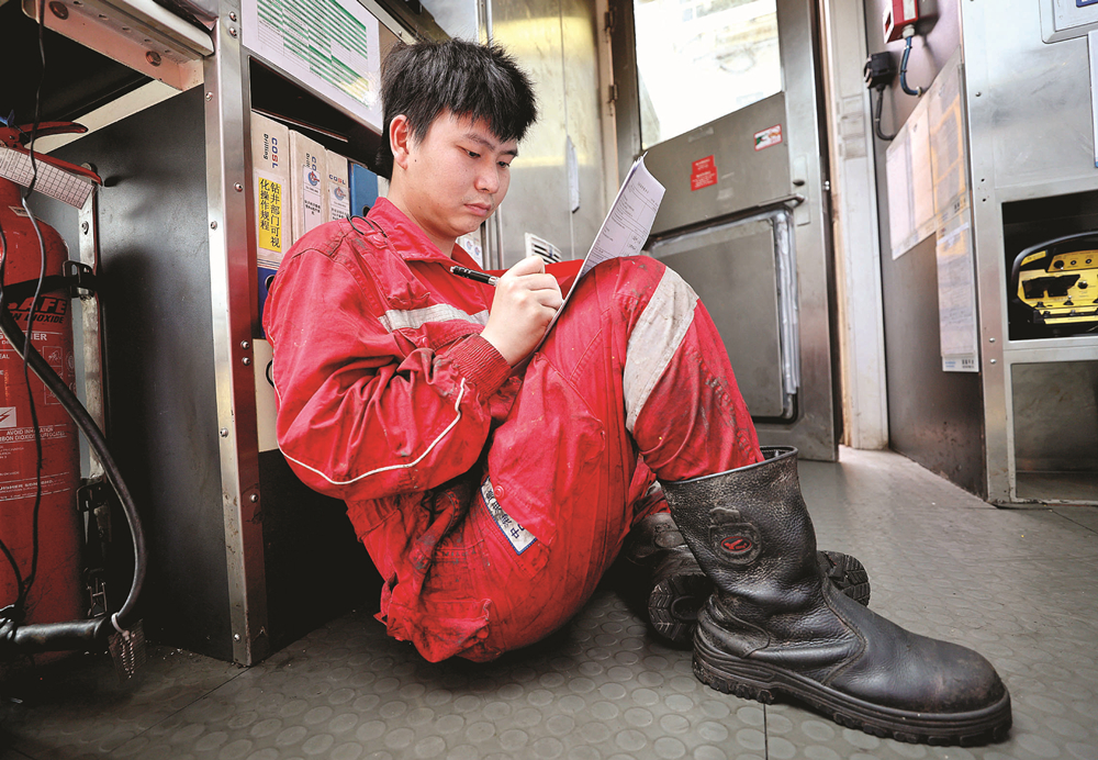 “國瑞”平臺司鉆房,一名石油工人席地而坐,認真填寫作業日志。