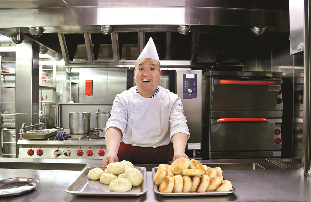“國瑞”平臺生活區,大廚為工人制作出可口的包子和肉餅。