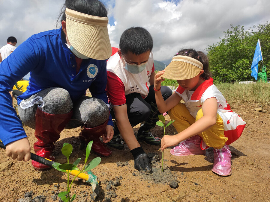 大亞灣志愿者在悉心呵護(hù)紅樹苗成長。