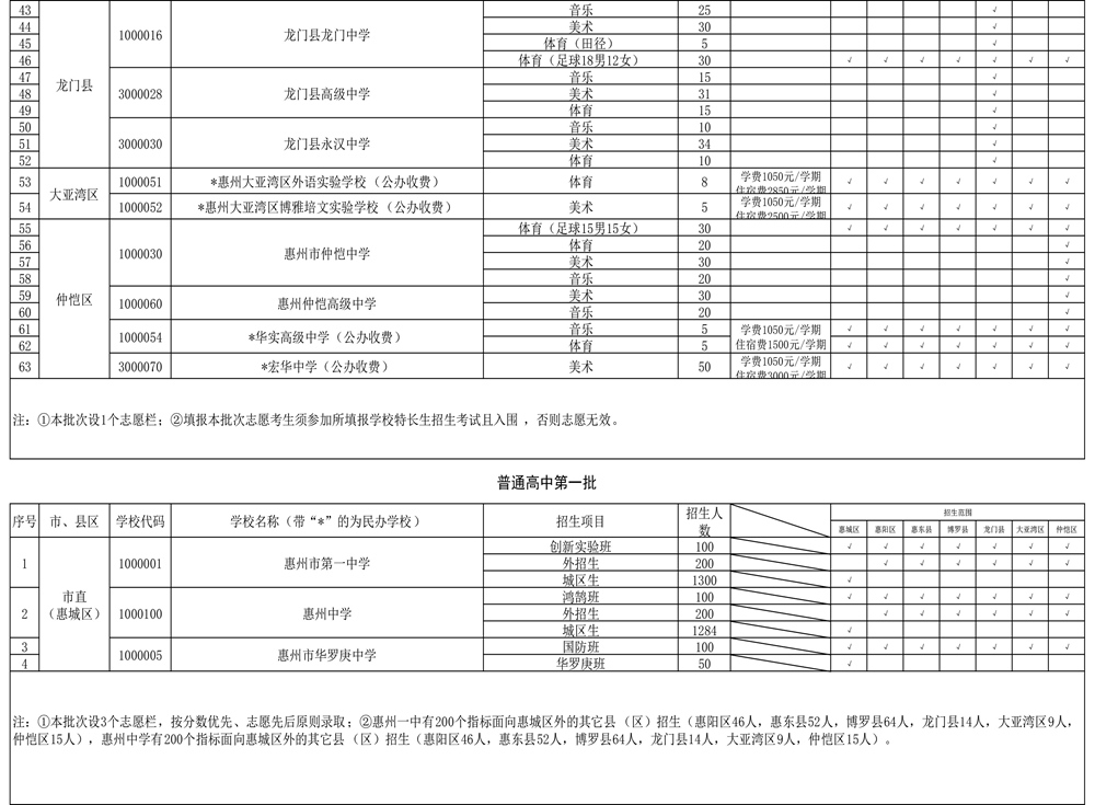 今年除個別學校外,全市民辦普通高中公辦生和民辦收費生繼續面向全市招生。同時,為進一步推動普通高中特色多樣化發展,各普通高中學校特長生計劃招生2309人,其中市直普通高中特長生全部面向全市招生?h(區)公辦普通高中特長生招生方面,除了惠東平山中學(女子籃球)、博羅華僑中學(籃球)、龍門中學(體育足球)、仲愷中學(體育足球)4個項目外,其他縣(區)公辦高中特長生均在屬地招生。