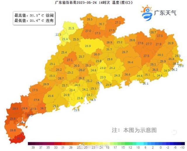 @廣東天氣 預計25日降水減弱,大部有(雷)陣雨,氣溫回升,部分市縣有35℃左右高溫;26日-27日大部晴到多云,35℃及以上高溫范圍擴大,天氣炎熱。