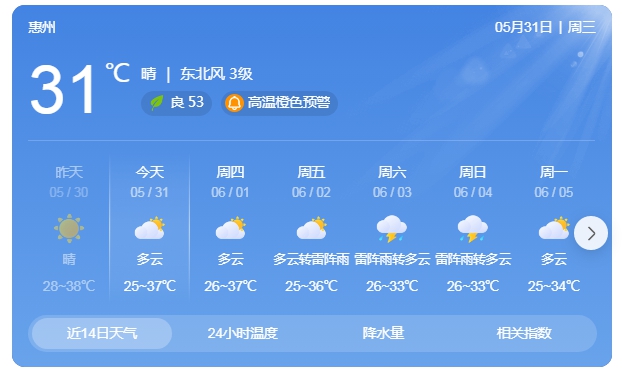 又訊 (記者周智聰 通訊員惠氣象宣)惠州市氣象臺5月30日早上發布今年首個高溫橙色預警信號;葜荻嗟30日突破5月最高氣溫歷史極值,全市96.9%的氣象站錄得37℃以上的高溫。
