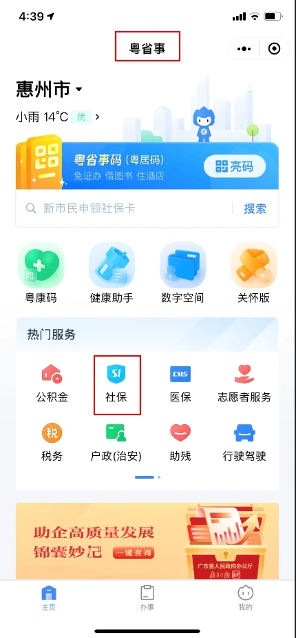 第一步:打開微信搜索“粵省事”找到“社保”登錄個人賬戶。