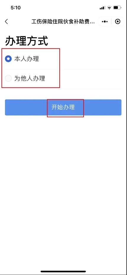 第三步:點擊“工傷保險住院伙食補助費申領”,根據提示授權,授權完畢后開始辦理(除“本人辦理”還可“為他人辦理”)。