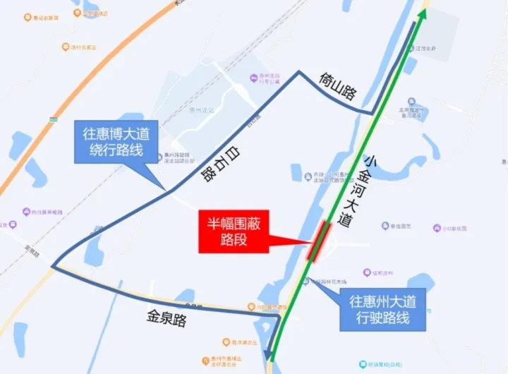 為確保施工期間道路交通安全、暢通、有序,惠州市公安局交通警察支隊根據《中華人民共和國道路交通安全法》等有關法律法規,對施工路段實施臨時交通組織。惠州交警建議,小金河大道往惠博大道方向車輛請繞行倚山路-白石路-金泉路,后返回小金河大道;小金河大道往惠州大道方向車輛根據交通指引可沿原路線通行。