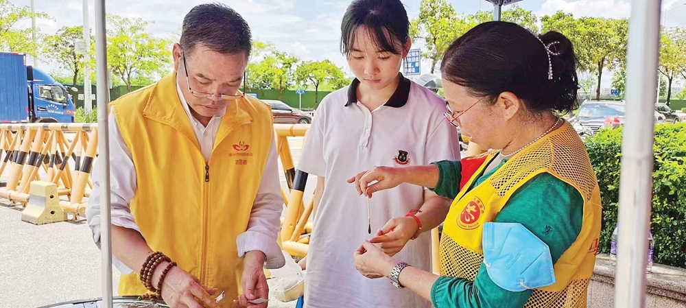 “阿姨,你們這里有創可貼嗎?”8日中午,上午考試結束后,在惠州市光正實驗學校考點,一位考生走出校門,走向志愿者所在的攤位。“有的有的,手怎么了,我看看。”在此值崗的志愿者譚小清急忙招呼她。女孩的左手拇指不小心劃破了皮,“還好劃得不深,消消毒包個創可貼即可。”譚小清和另外一名志愿者趕緊打開醫藥箱,拿了碘伏給考生的手指消了毒,包上創可貼,“沒事的,你下午考完后,可以再過來換下藥消下毒,我再給你幾個創可貼,晚上洗澡后再換一下。”譚小清不停地寬慰女孩,“有什么需要,都可以跟我們說,我們這幾天都在這里。”