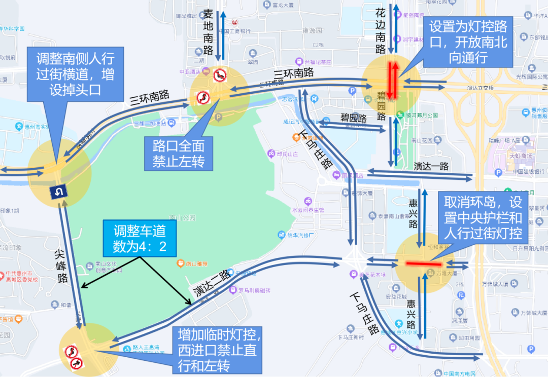 二、交通組織調整:施工期間,三環南路/麥地南路路口全面禁止左轉;三環南路/花邊南路路口設置為燈控路口,開放南北向通行;演達二路/惠興路路口取消交通環島并設置東西向中央護欄和人行過街燈控;演達二路/尖峰路路口設置臨時燈控,西進口禁止直行和左轉;三環南路/尖峰路路口調整南側人行過街橫道位置,并增設掉頭口;尖峰路路段車道數調整為北往南4車道、南往北2車道;演達二路(尖峰路-下馬莊路段)路段車道數調整為西往東4車道、東往西2車道。
