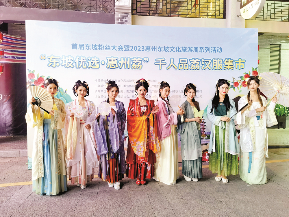 在水東街,市民則開啟了打卡東坡美食文化之旅。分會場的“千人同品東坡荔”暨漢服集市活動,以“佳人相見一千年”為主題,將惠州手信與荔枝成熟季相結合,以東坡荔枝、惠州手信、東坡文創潮玩為賣點,可以說囊括了“吃喝玩樂”各個維度。