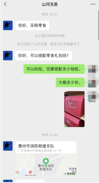 微信名為“山河無恙”的男子添加零食店店家微信后,發送了惠州市消防救援支隊的真實地址,并提供了一份蓋有“ 中國人民消防救援部隊 后勤專用章”的“線下采購確認通知書”。