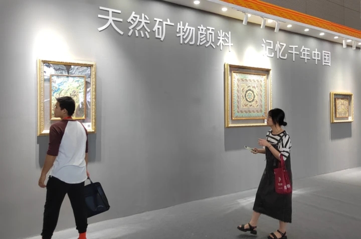 記者留意到,展覽會(huì)現(xiàn)場設(shè)有“天然礦物顏料 記憶千年中國”畫展、“溯源重生”邱楚蓮巖彩畫藝術(shù)作品展,所展出的數(shù)十幅繪畫,均使用惠州所產(chǎn)的天然礦物顏料,彩畫與彩色寶石互相輝映。