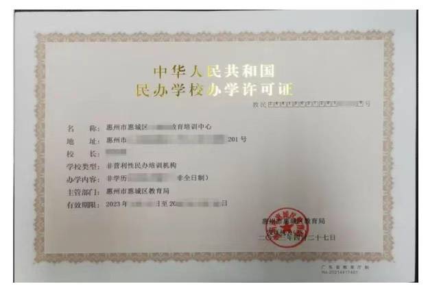一些家長對《工商營業執照》、《教師資格證》,特別是《辦學許可證》比較陌生,內容也看不懂。對此,為了更好的讓廣大家長簡單明了認準合規機構,惠城區教育局擬制校外培訓機構合規機構標識(如圖一標識),要求證照齊全的培訓機構在大門處張貼標識以及本機構《辦學可許證》彩色復印件(如圖二示例)。通過掃一掃標識中的二維碼,家長可查詢合規機構的名單(名單實行動態更新),《辦學可許證》上也注明了該機構的培訓范圍類別。通過標識來選擇機構,簡單明了,不必再去學怎么看證件以及內容,認準“標識”就不會被“忽悠”。